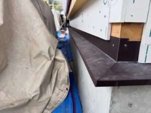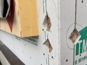 大型パネルでの建て方のその後は、外壁耐力面材のモイスは、土台付近の調整部分を足す程度の作業。