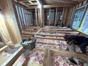 金物工法は、仕口という材が直交する部分の接合部は材の側面に取り付いた金物で受けるため、材同士が重なる組み方ではなく、壁が建ってからでも床下地となる大引を入れることが可能です。