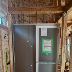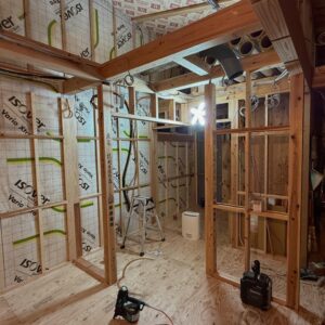 内部は天井下地や間仕切り下地をしながら、電気屋さんの配線工事と並行中。
