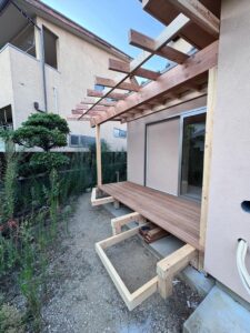以前は後付け屋根がかかっていた単純な物干し場でしたが、それも傷んでいたために撤去し、ウッドデッキを含めて再構築。