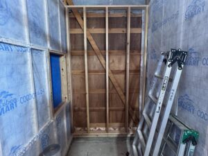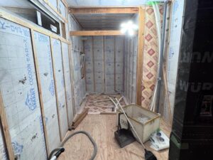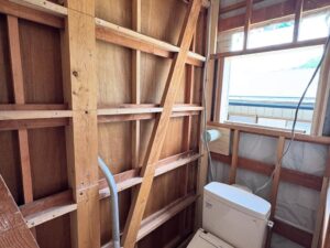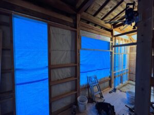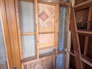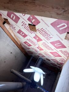 そして、今回は壁内にある「無造作な隙間」に区切りをしないと、断熱効果が落ちてしまうため、部分的に工夫しなければいけないところもあり、そこは柔軟にボード系断熱材・発泡ウレタン・防水シートなどを駆使しながら対処しています。