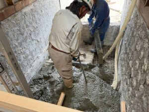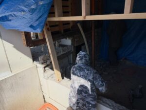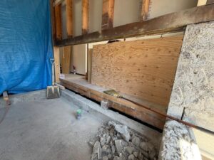 ブロック構造である以上、ユニットバスの納まり上、この部分の断熱はできないということで、施主様に相談したところ、断熱を重視するため、木質化をご依頼いただきましたので、ブロックを撤去です。
