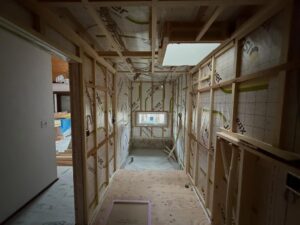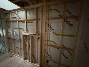 水廻り改修。シートで防湿気密を確保して内装下地と電気配線。